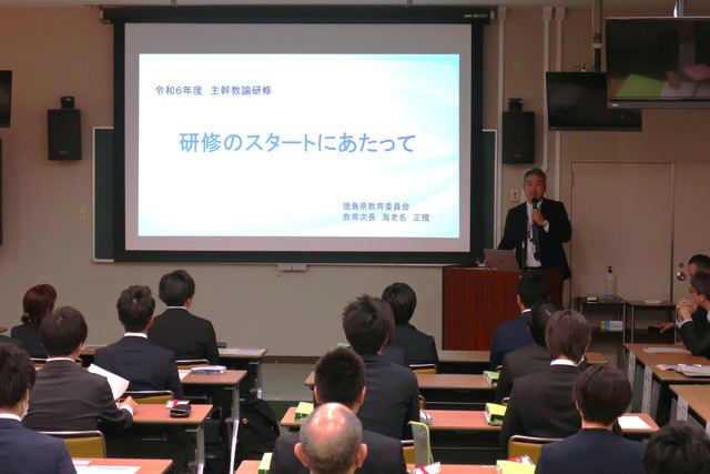 開講式では,徳島県立総合教育センター 住友 次長よりご挨拶,徳島県教育委員会 海老名 教育次長より訓話をいただきました。