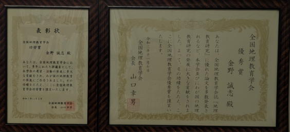 全国地理教育学会から「功労賞」を授与されました。この学会からは、令和3年に「優秀賞」もいただいています。文化遺産の価値についてて判断し、国際理解を深めていく学習をここ7年ほど進めています。この4年間ほどは、台湾の学校教育における台湾史の中で、日本統治期の近代産業遺産の価値がどのように捉えられ判断されているかということを、日本の子どもたちが学習しながら、自分たちと国際社会との関わりについて考えていくという研究を進めています。こんなことが、こょうかされたのかなと思っています。