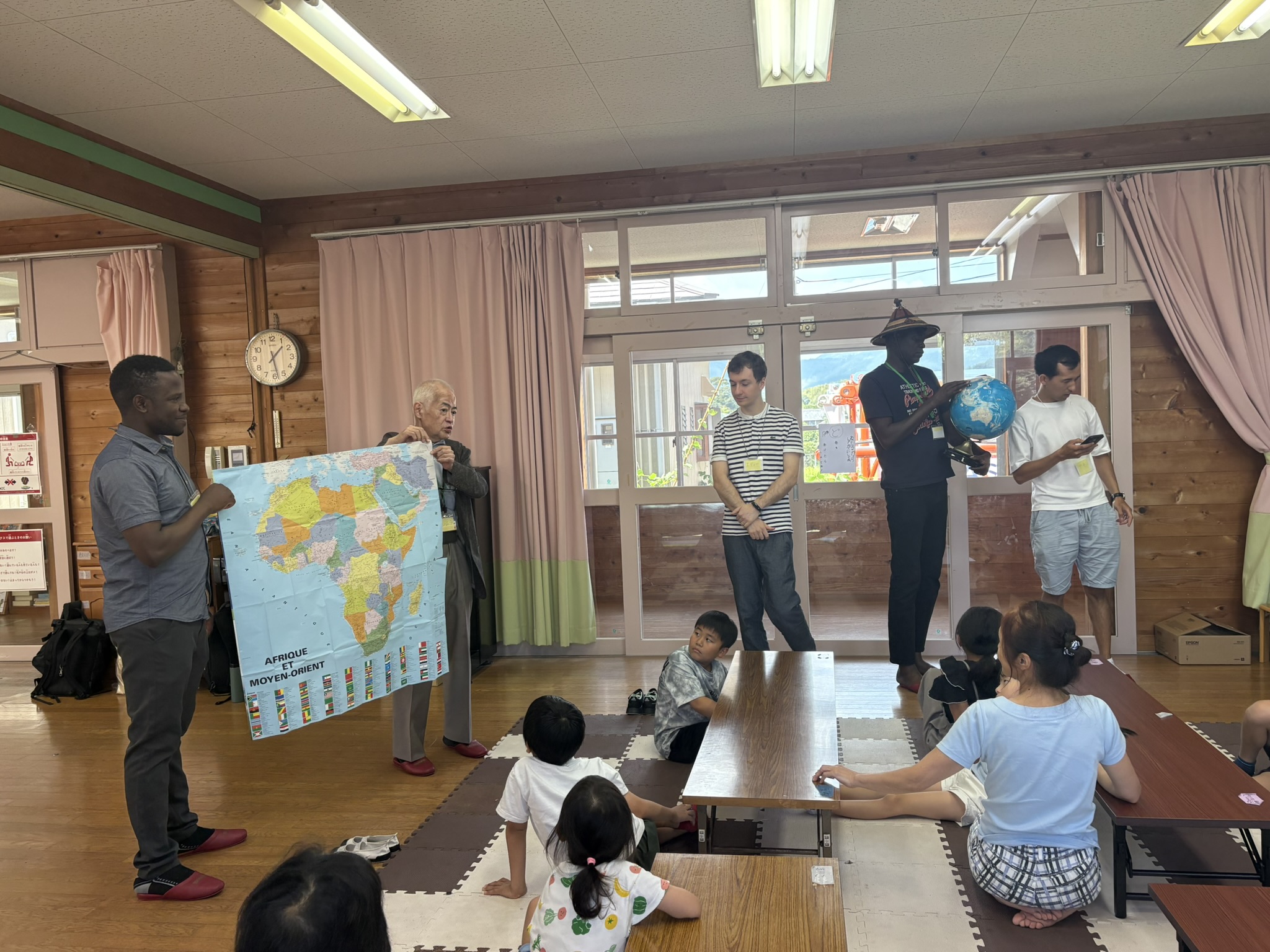夏期休暇中の学童保育を受けている子どもたちに、ブルキナファソ、ウガンダ、ウズベキスタン、フランスの