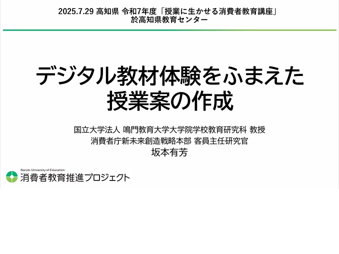 高知県県民生活課、高知県教育センター主催 令和7年度「授業に生かせる消費者教育講座」が高知県教育センターで開催され、 本プロジェクトリーダー坂本有芳教授が講義を行いました。