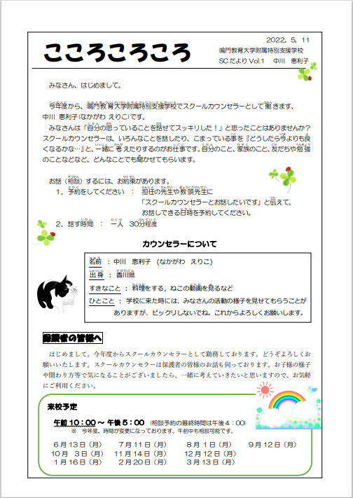実施日等についてはスクールカウンセラーだより「こころころころ」をご覧ください。