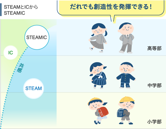 幼稚園では主にSTEAMの内容を学ぶが、小学校、中学校へと進むにつれて徐々にICの要素が加わる。